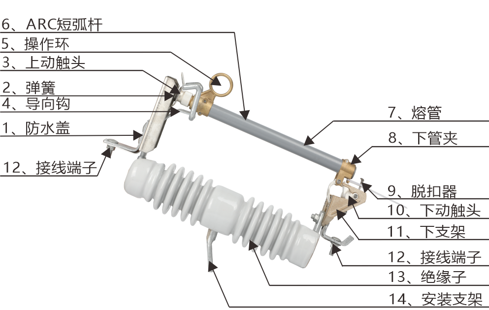 從整體架構(gòu)來看,跌落式熔斷器主要由絕緣支座、動靜觸頭、熔絲管三大部分構(gòu)成。